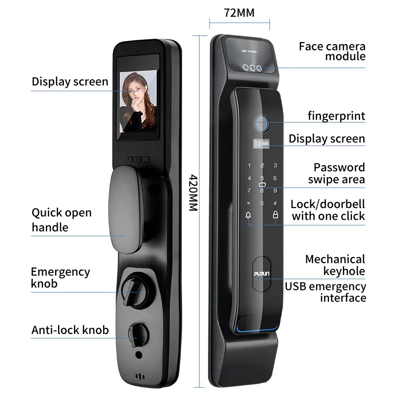 Als professionele fabrikant en leverancier van intelligente sloten, gevestigd in China, heeft PuXin een rijke ervaring in de intelligente deurslotindustrie, met gunstige prijsvoordelen en dekking van de meeste Europese en Amerikaanse markten. De PuXin DF65 3D Face Smart Lock, een kernbiometrisch product, beschikt over een zeer nauwkeurig binoculair infrarood gezichtsherkenningsalgoritme en hoogwaardige oppervlakteverwerking, waardoor efficiënte ontgrendeling, duurzaamheid en antistatische prestaties worden gegarandeerd.
